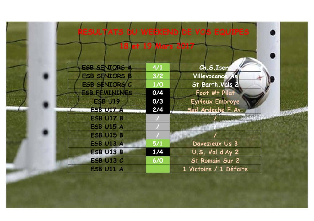 Résultats des équipes du 18 et 19 Mars 2017