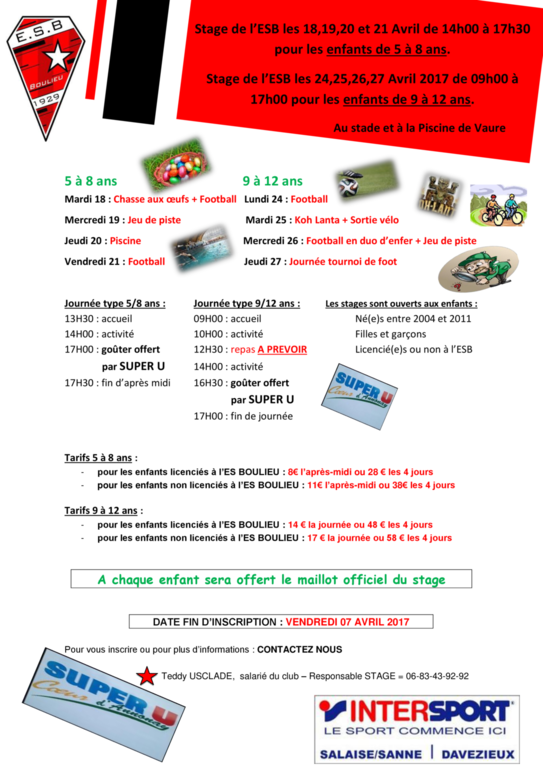 Pendant les vacances de la Paques, l'ETOILE SPORTIVE BOULIEU organise un stage pour les enfants de l'école de football (des 5 ans à 12 ans) .