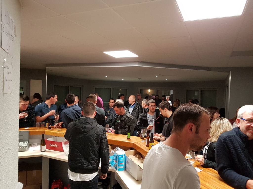 La salle était instalée sur le thème "Bar à vin" avec des tables rondes et plusieurs espaces pour les groupes! des plateaux de charcuteries de Julien Vert étaient posés à la vente. Une belle soirée pour passer un moment entre amis et passionés du ballon rond.