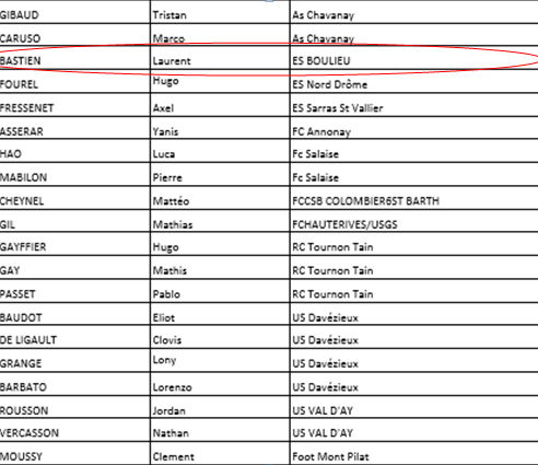 5 joueurs du club ont participé à la première détection et 1 joueur a été retenu: Laurent Bastien, né en 2004