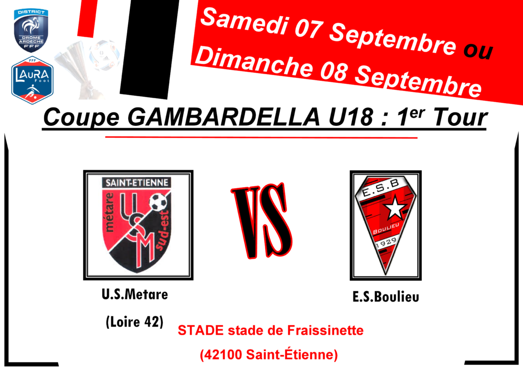 Cette année, ce sont nos U18 qui disputent la fameuse Coupe Gambardella. Pour le compte du 1er tour, nos joueurs rentreront en lice à l exterieur contre le club US METARE (Loire 42)