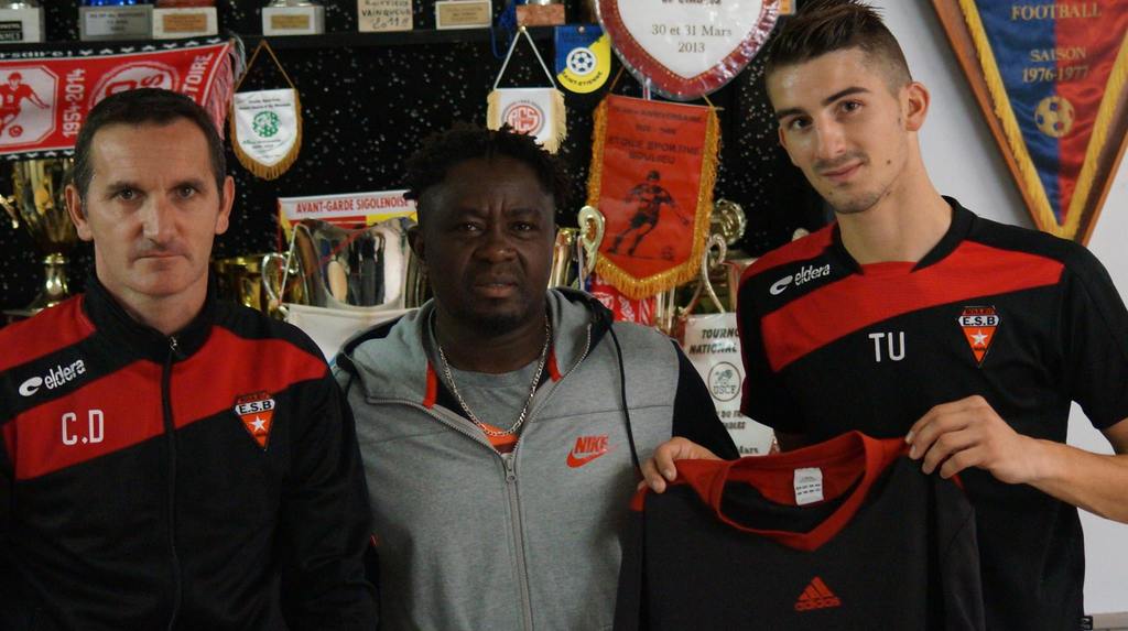 Le Club a remis 2 jeux de maillots enfants et 1 jeu de maillots adultes qui ne servent plus mais qui sont en très bon état à l'Association "Village faisons du sport" au sud du Cameroun, en compagnie du responsable de l'association Edouard Belinga, de Charly Duvert éducateur des seniors A et Teddy Usclade salarié du club.