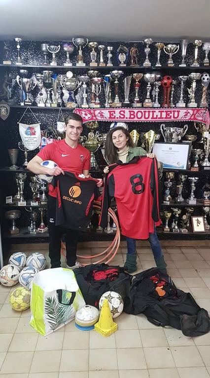 Le Club a remis deux jeux de maillots enfants et un jeu de maillot adulte qui ne servent plus mais qui sont en très bon état à l'Association "Carrefour d'Echanges Culturels( CEC-Togo )", en compagnie d'une responsable Célia Vidal.