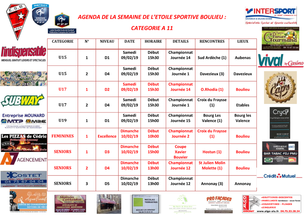 AGENDA DE LA SEMAINE DE L’ETOILE SPORTIVE BOULIEU : CATEGORIE A 11