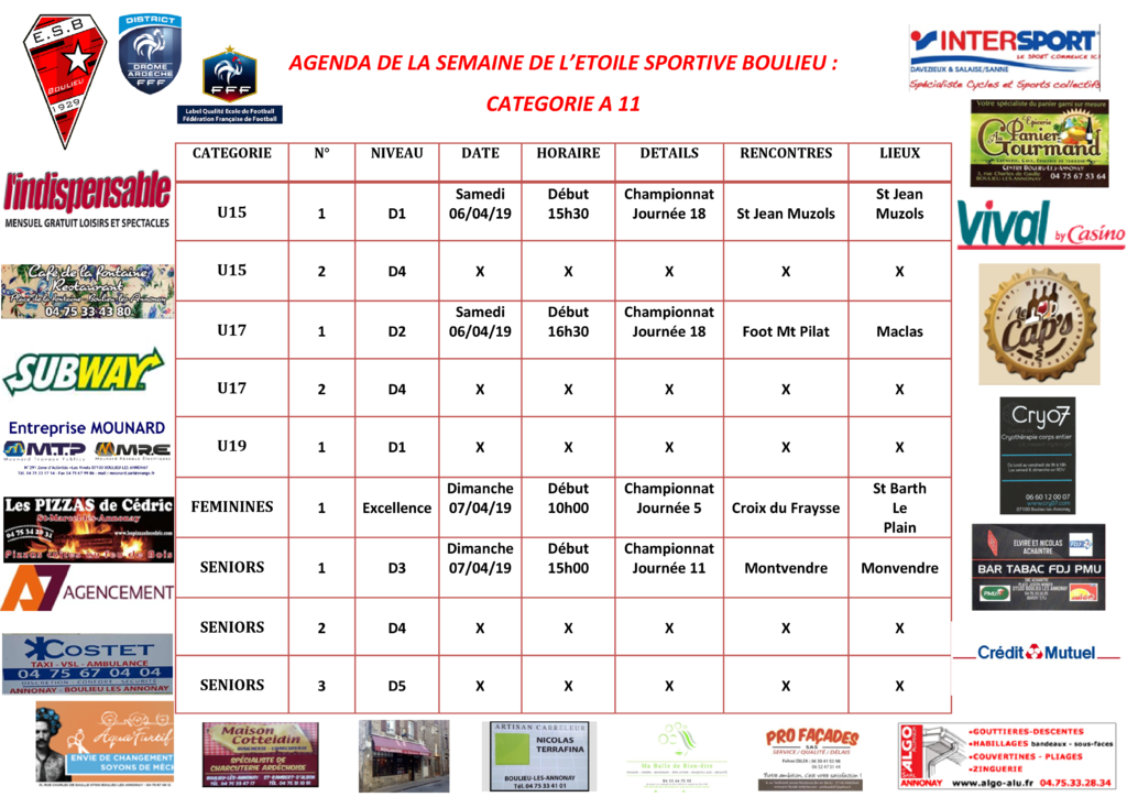 AGENDA DE LA SEMAINE DE L’ETOILE SPORTIVE BOULIEU : CATEGORIE A 11