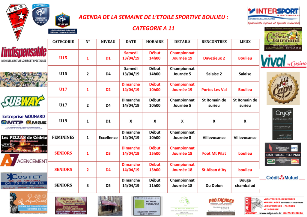 AGENDA DE LA SEMAINE DE L’ETOILE SPORTIVE BOULIEU : CATEGORIE A 11