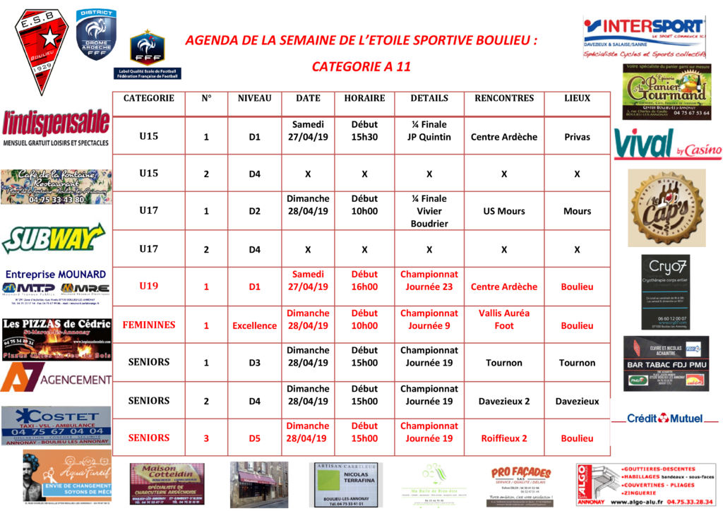 AGENDA DE LA SEMAINE DE L’ETOILE SPORTIVE BOULIEU : CATEGORIE A 11
