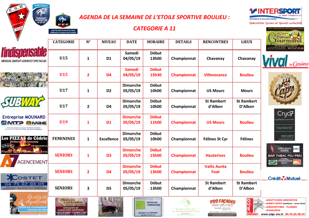 AGENDA DE LA SEMAINE DE L’ETOILE SPORTIVE BOULIEU : CATÉGORIE A 11
