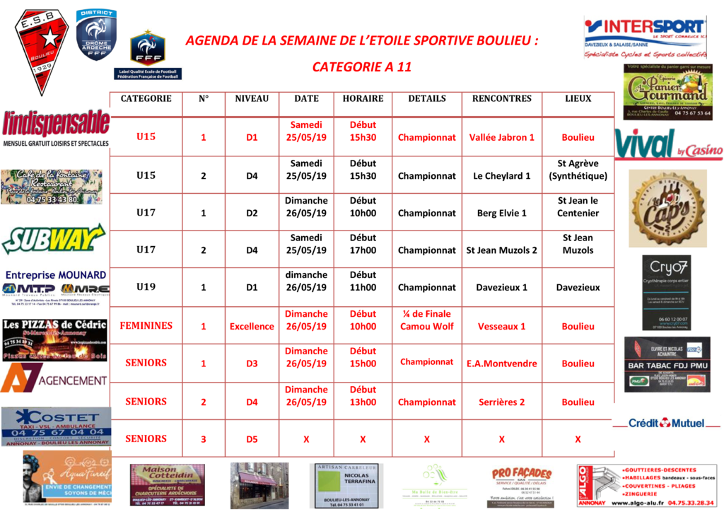 AGENDA DE LA SEMAINE DE L’ETOILE SPORTIVE BOULIEU : CATEGORIE A 11