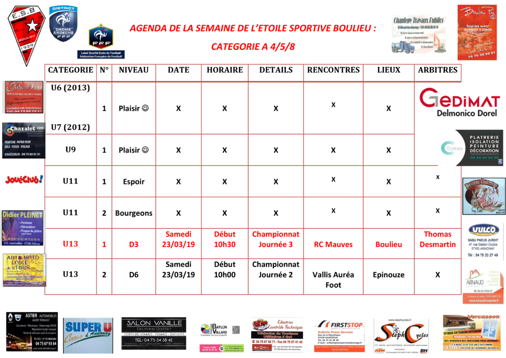 AGENDA DE LA SEMAINE DE L’ETOILE SPORTIVE BOULIEU : CATEGORIE A 4/5/8