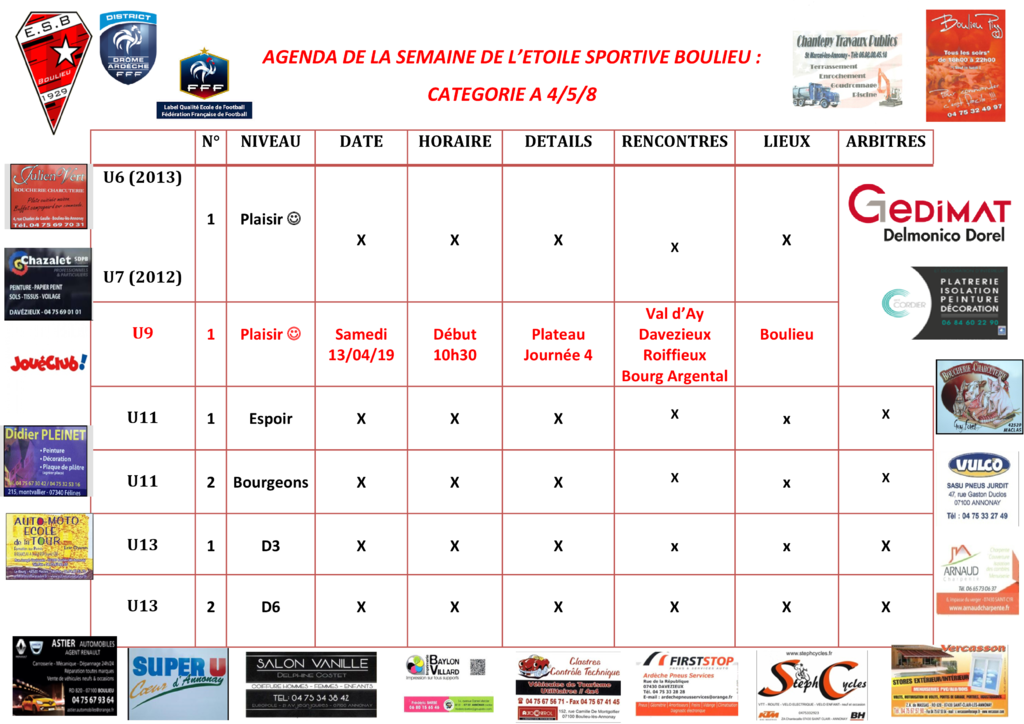 AGENDA DE LA SEMAINE DE L’ETOILE SPORTIVE BOULIEU : CATEGORIE A 4/5/8