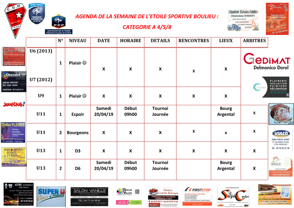 AGENDA DE LA SEMAINE DE L’ETOILE SPORTIVE BOULIEU : CATEGORIE A 4/5/8