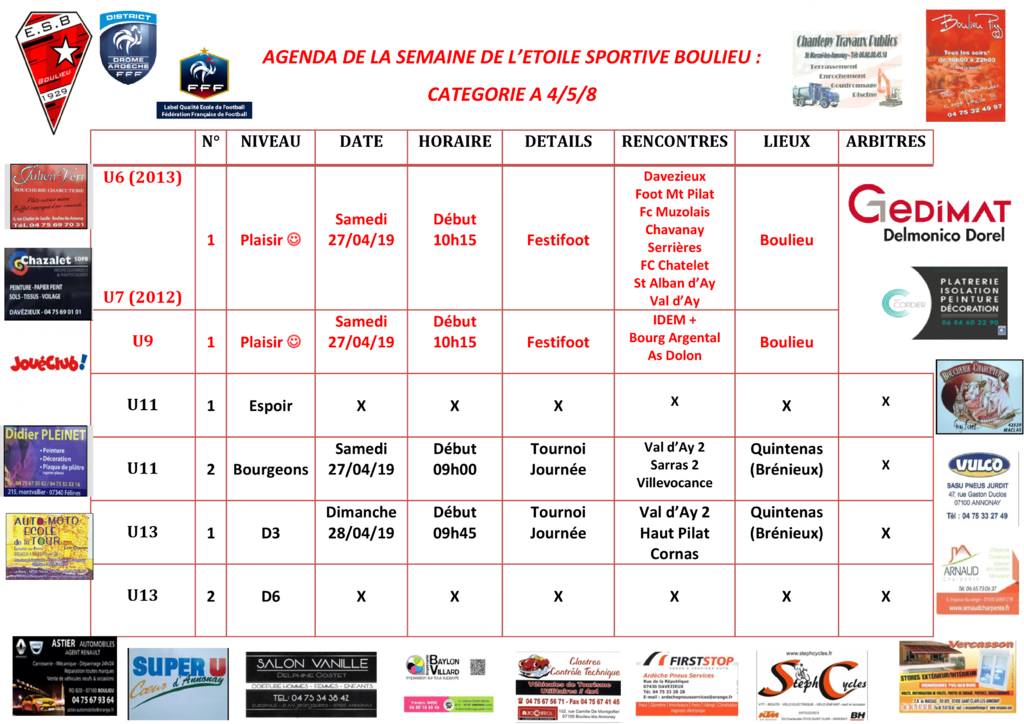 AGENDA DE LA SEMAINE DE L’ETOILE SPORTIVE BOULIEU : CATEGORIE A 4/5/8