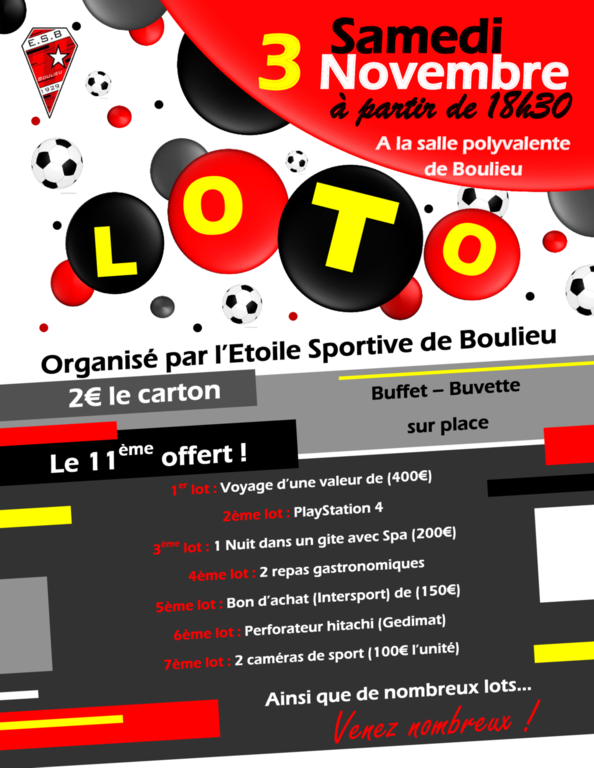 Le samedi 03 novembre 2018, Loto du foot organisé par l'Etoile Sportive Boulieu à partir de 18h30, à la salle polyvalente de Boulieu.
