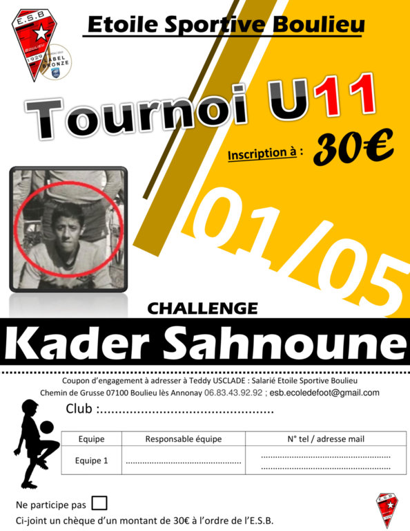 20 équipes sont attendues dans la catégories U11 et U13 Le tournoi commencera à 9h00 et terminera aux alentours de 15h45. Comme chaque année vers 16h00 aura lieu la remises des coupes et du Challenge Kader Sahnoune pour le vainqueur catégorie U11 et du Challenge Christophe Molard pour le vainqueur de la catégorie U13.