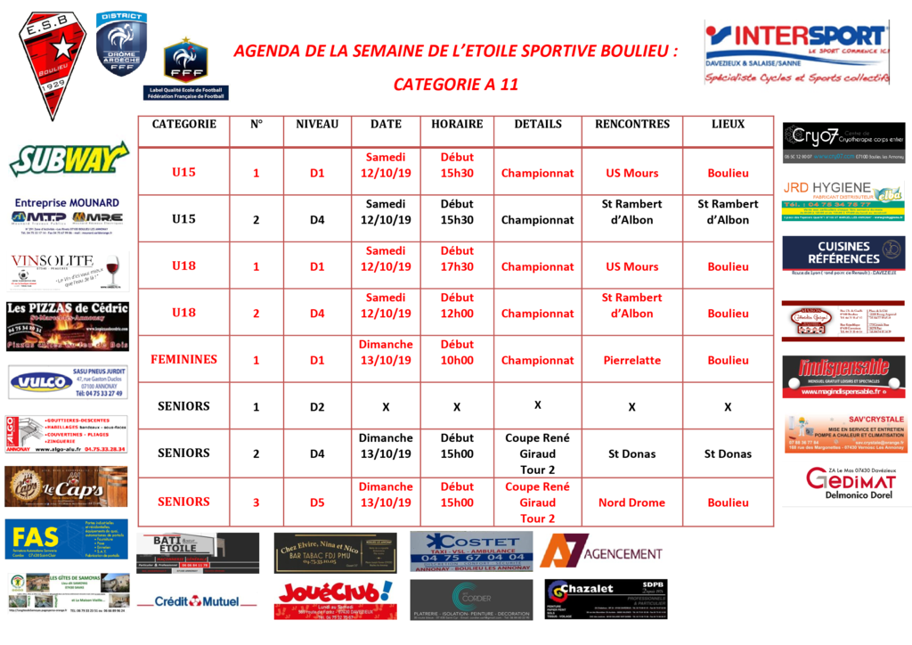 AGENDA DE LA SEMAINE DE L’ETOILE SPORTIVE BOULIEU : CATEGORIE A 11