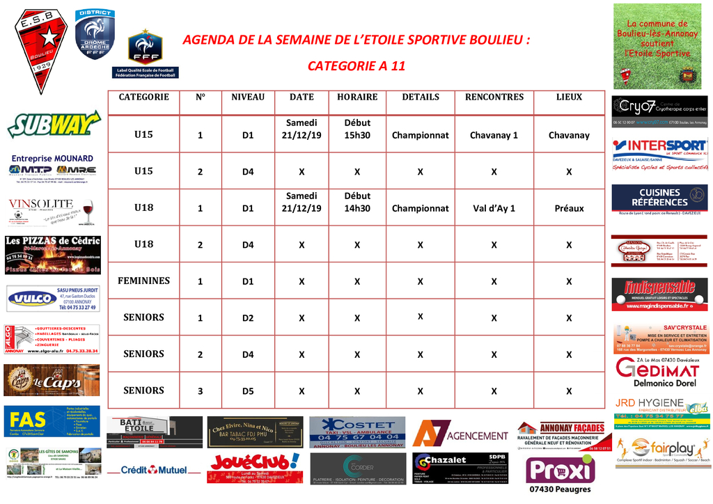 AGENDA DE LA SEMAINE DE L’ETOILE SPORTIVE BOULIEU : CATEGORIE A 11