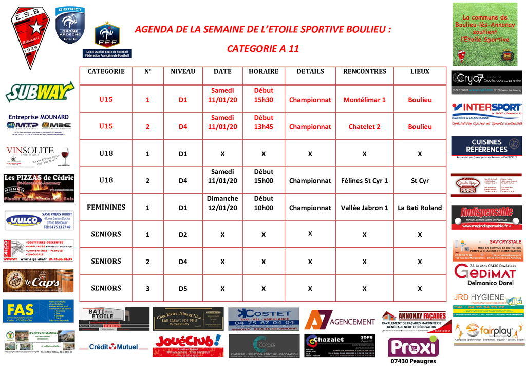 AGENDA DE LA SEMAINE DE L’ETOILE SPORTIVE BOULIEU : CATEGORIE A 11