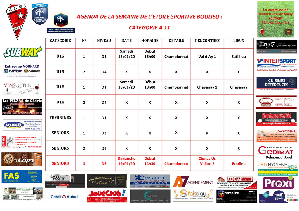 AGENDA DE LA SEMAINE DE L’ETOILE SPORTIVE BOULIEU : CATEGORIE A 11