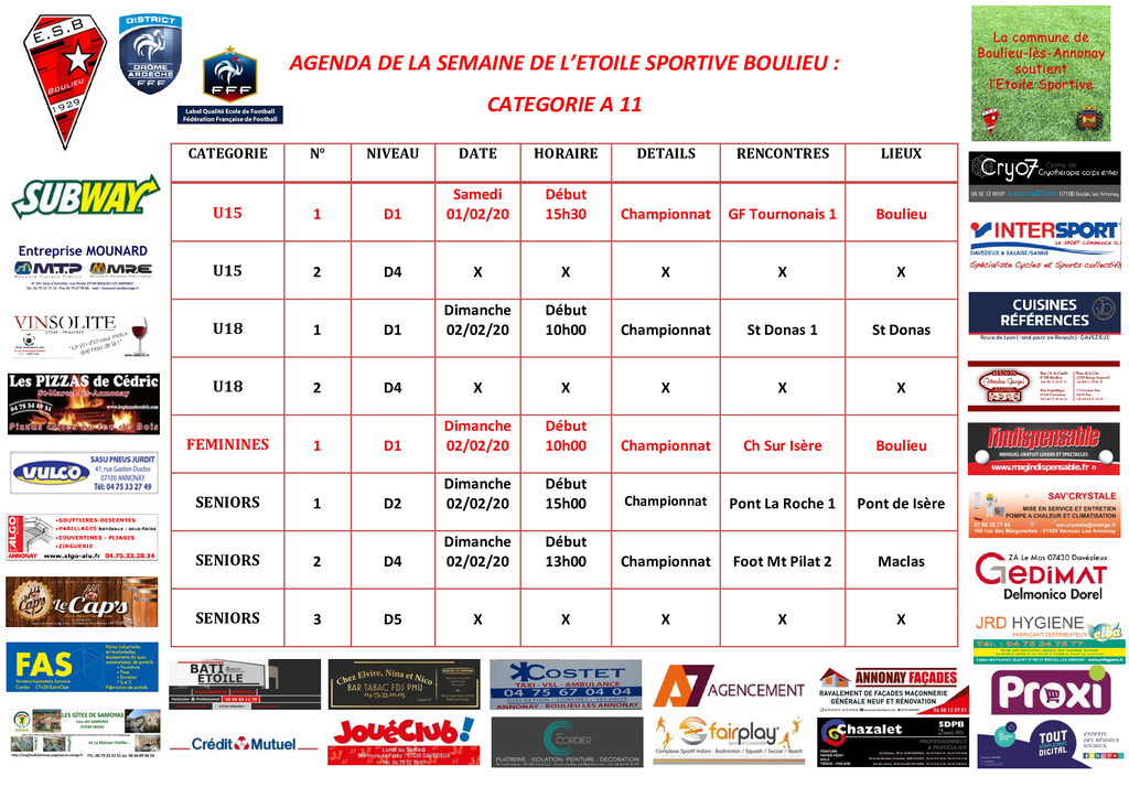 AGENDA DE LA SEMAINE DE L’ETOILE SPORTIVE BOULIEU : CATEGORIE A 11