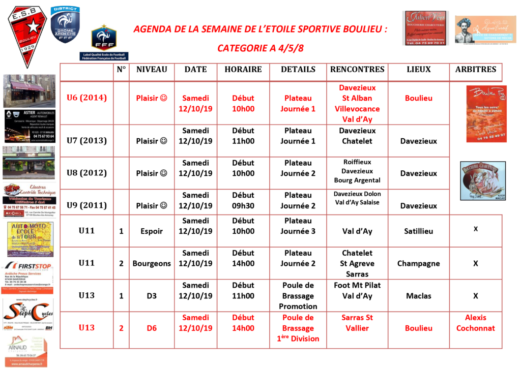 AGENDA DE LA SEMAINE DE L’ETOILE SPORTIVE BOULIEU : CATEGORIE A 4/5/8