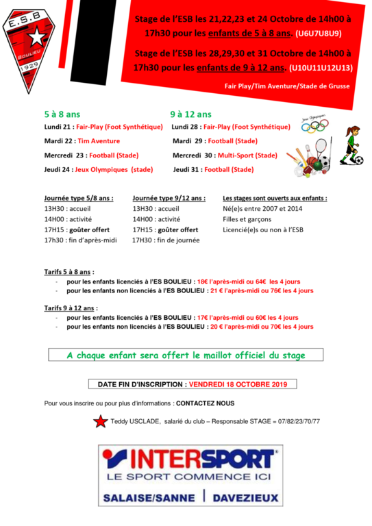 Pendant les vacances de la Toussaint, l'ETOILE SPORTIVE BOULIEU organise un stage pour les enfants de l'école de football (des 5 ans à 12 ans) . Année 2014 à 2007.