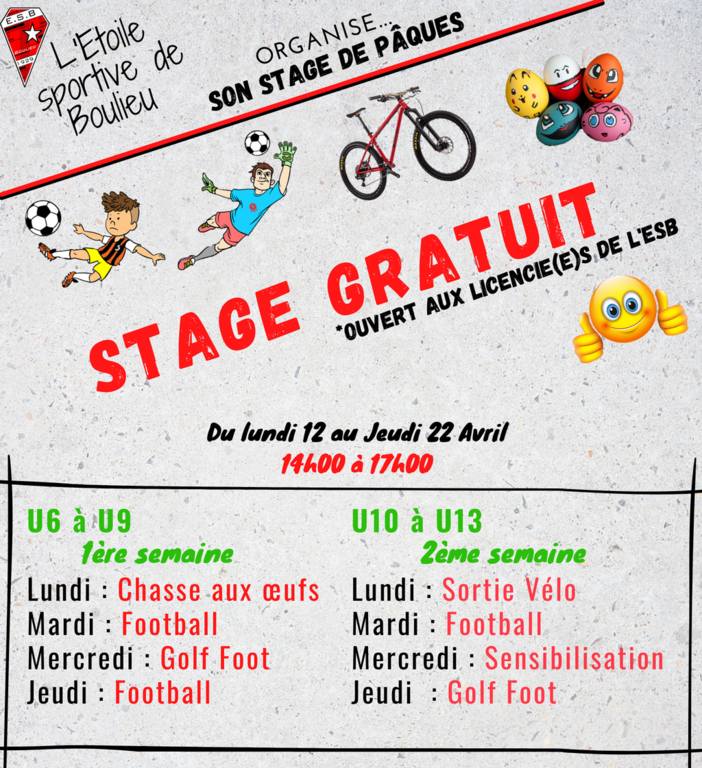 U6 à U9 : Du Lundi 12 au Jeudi 15 Avril de 14h00 à 17h00.